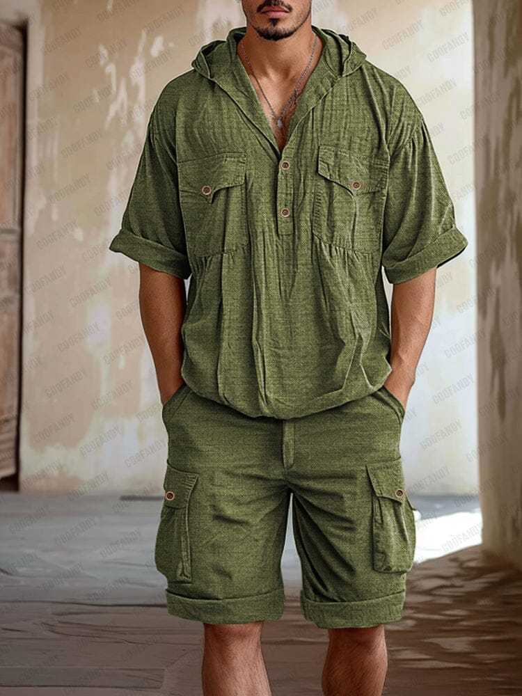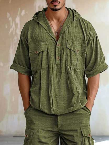 T-shirt Details: Hooded, short sleeves, two chest pockets with button closure